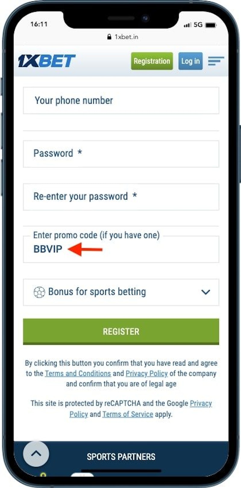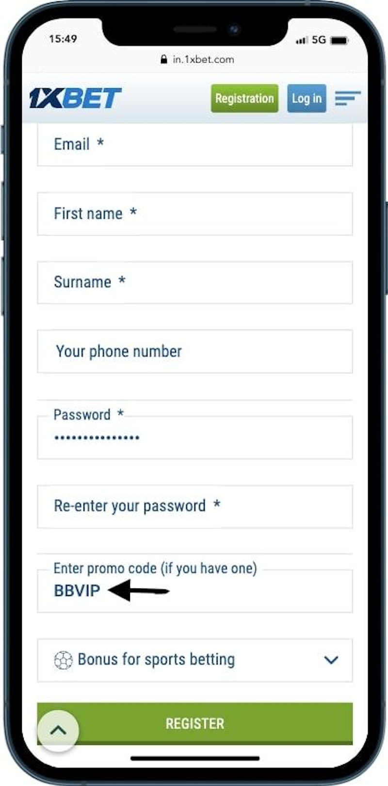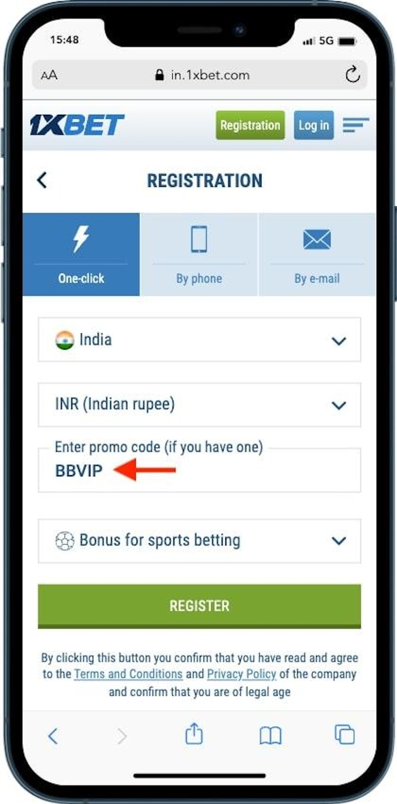 Use the promo code for 1xBet India “BBVIP” in the designated field that says “Enter promo code”.